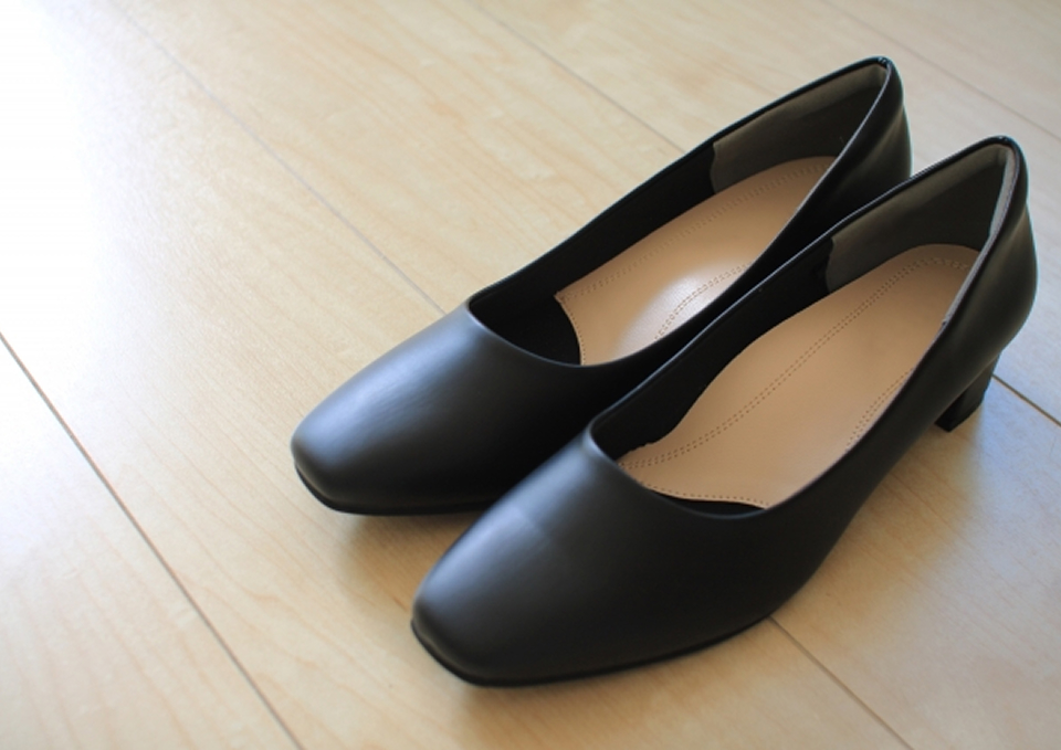 女性は黒で甲の露出が少ない婦人靴が基本です。かかとは高すぎず、太めで安定する形が安心。新調した靴は、家の中で短く履き慣らします。